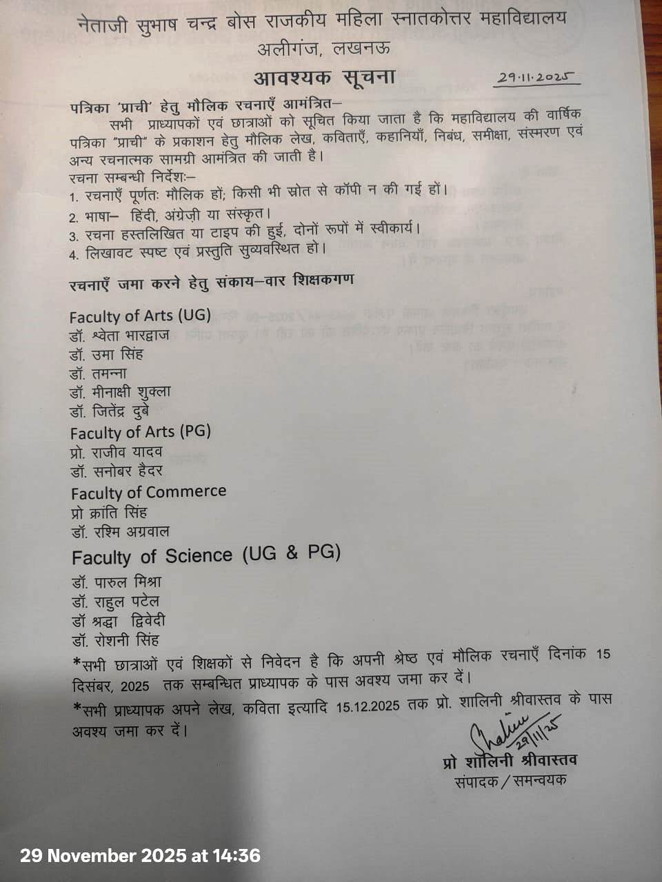 महाविद्यालय पत्रिका प्राची हेतु सूचना